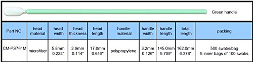 -. Brand : Cleanmo -. EAN : 0606993974566 -. Feature : Laundered and packed under an ISO 5 Cleanroom, The foam exhibits low particles and ion content. / It has excellent compatibility with most solvents including acetone as well as excellent absorbency and solvent-holding capacity . -. IsAutographed : 0 -. IsMemorabilia : 0 -. Label : Cleanmo Technology -. Manufacturer : Cleanmo Technology -. MPN : CM-PS761M -. NumberOfItems : 1 -. PartNumber : CM-PS761M -. ProductGroup : BISS -. ProductTypeName : LAB_SUPPLY -. Publisher : Cleanmo Technology -. Studio : Cleanmo Technology -. Title : Cleanroom Microfiber Head Swab,500 pcs/bag, 6.378'' in total length, to clean the recessed areas -. UPC : 606993974566