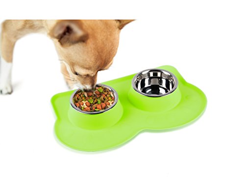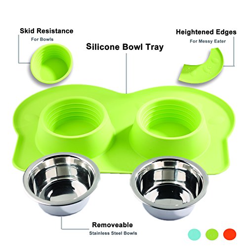 DETACHABLE BOWLS FULL DINNER SET Set of 2 dog bowls. Works as a full dinner set with food and water for one. The extra large base of the silicone stand catches any spills so your floor stays clean.