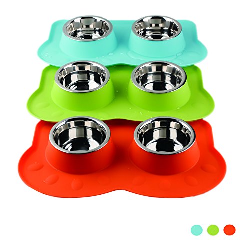 NON-SKIDDING FLIPPING DOG BOWLS Silicone stand keeps the bowl from skidding on the floor and doesn't slide all over the place when your dog is eating. The base of no spill silicone mat feeder bowls is BPA free silcone and the bowls are stainless steel.