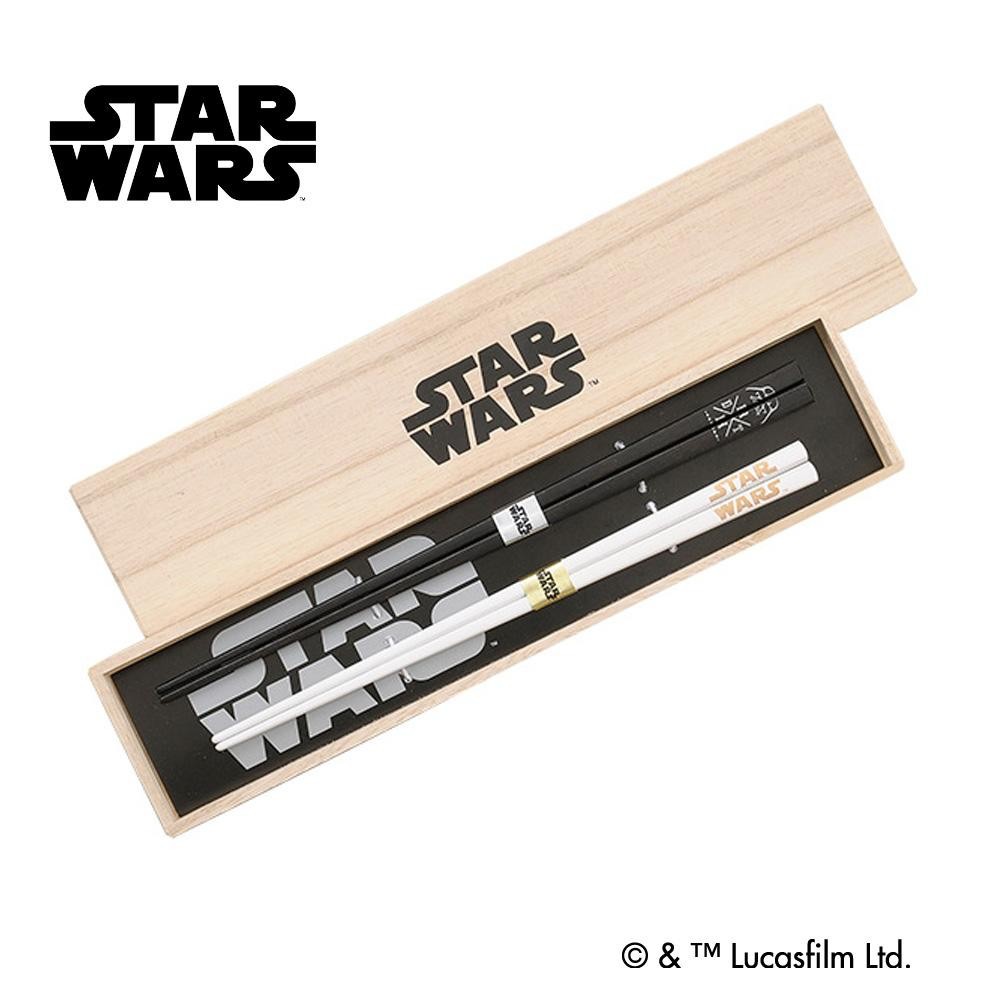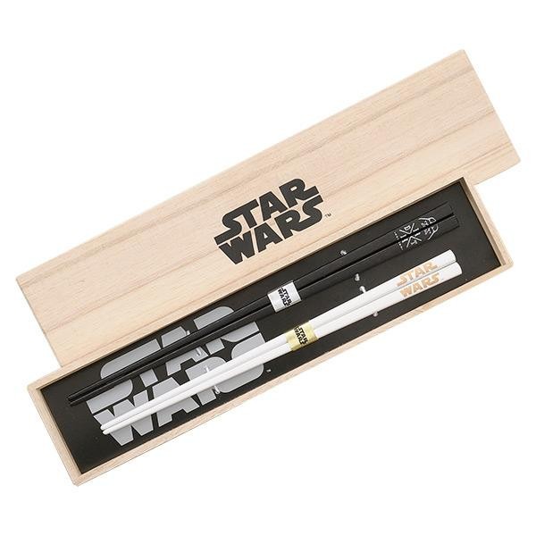 黒の大きい方のお箸にはダース・ベイダーのデザインが、白い小さい方のお箸にはロゴが入っています。木箱入りなので、プレゼントに最適です。