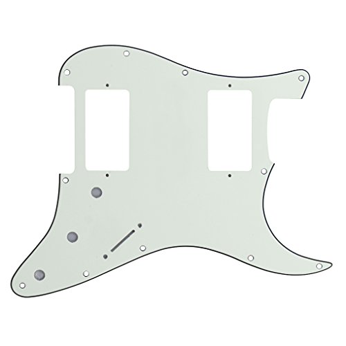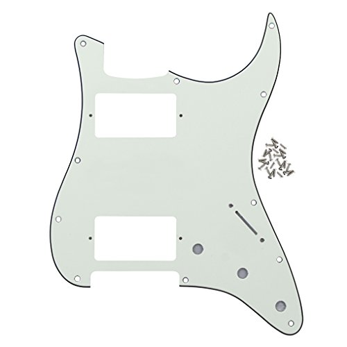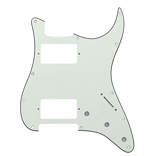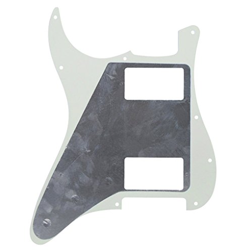 Product Description Specification:Humbucker-Humbucker pickguard, 11 hole standard mounting pattern with counter-sunk mounting screw holes.3 control pot holes pre-drilled in Standard Volume-Tone-Tone Positions (Positions 1, 2, 3).1 standard size switch cut with 2 switch mounting holes (1 each side of switch cut; not counter-sunk).Humbucker hole size: 38mm x 70mmHumbucker screws center/center: 78mmMaterial: Made of 3ply PVC, with off set screw holes and beveled edge.With pure aluminum foil shielded.Color: Aged WhiteWith protective film on the surface, while using please split it off.Note:Item's color might be different from the picture because of the aberration.Package Includes:1 x guitar pickguard25 x mounting screws 0