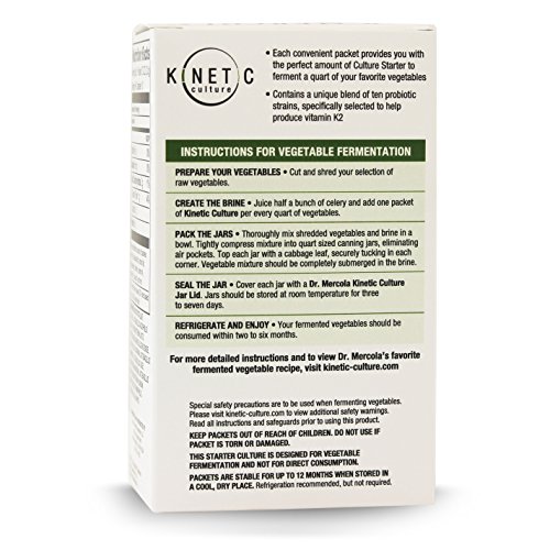 -. Feature : Dr Mercola Kinetic Culture Starter provides the right probiotics strains for fermenting your own veggies. It can save you time, yield more consistent results, and can even help you increase the levels of certain nutrients and vitamins. / Dr Mercola Culture Starter contains probiotic strains that produce vitamin K2, a product of bacterial fermentation. You will end up with low K2 levels if these strains are not present in the vegetables or in the starter culture you use. / Dr Mercola Kinetic Culture Starter Packets are easy and convenient - simply open the packet, add it to your brine, and start fermenting without measuring or a mess. Each packet yields 1 quart of fermented veggies. / Fermented foods can help support your health - they can provide higher concentrations of nutrients, and contain natural levels of prebiotics that stimulate beneficial microflora growth in your gut. / Vitamin K2 can help build strong bones, provide vascular and heart health support, protects cells and supports the immune system - Kinetic Culture Starter can potentially help increase your levels of K2!
