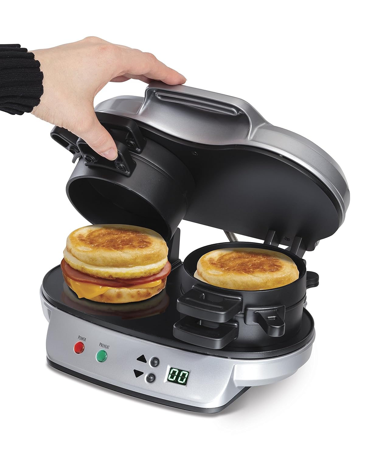 Ready in 5 minutes Cook delicious breakfast sandwiches in the comfort of your own home Use your own fresh ingredients, including eggs, cheese and much more Timer with audible tone; Quick and easy recipes included; Easy cleanup - all removable parts are dishwasher safe Use your own fresh ingredients, including eggs, cheese, and much more Makes 1 or 2 sandwiches Quick and easy in 5 minutes Timer with audible tone Product Dimensions: 7.8 x 10.4 x 5.9 inches ; 4.8 pounds