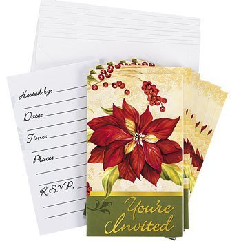 - This Invitations feature a poinsettia bloom with holly berries over an off-white and gold background