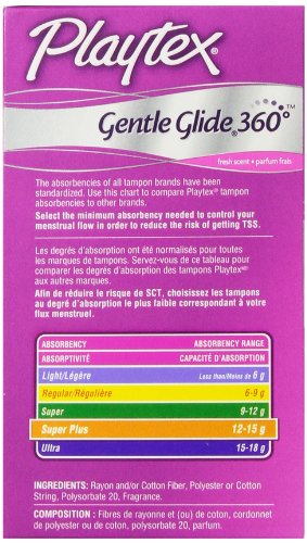Plastic applicator. The absorbencies of all tampons brands have been standardized. Absorbency: Regular 6-9 g; Absorbency; Super 9-12 g; Super Plus 12-15 g. Made in U.S.A.
