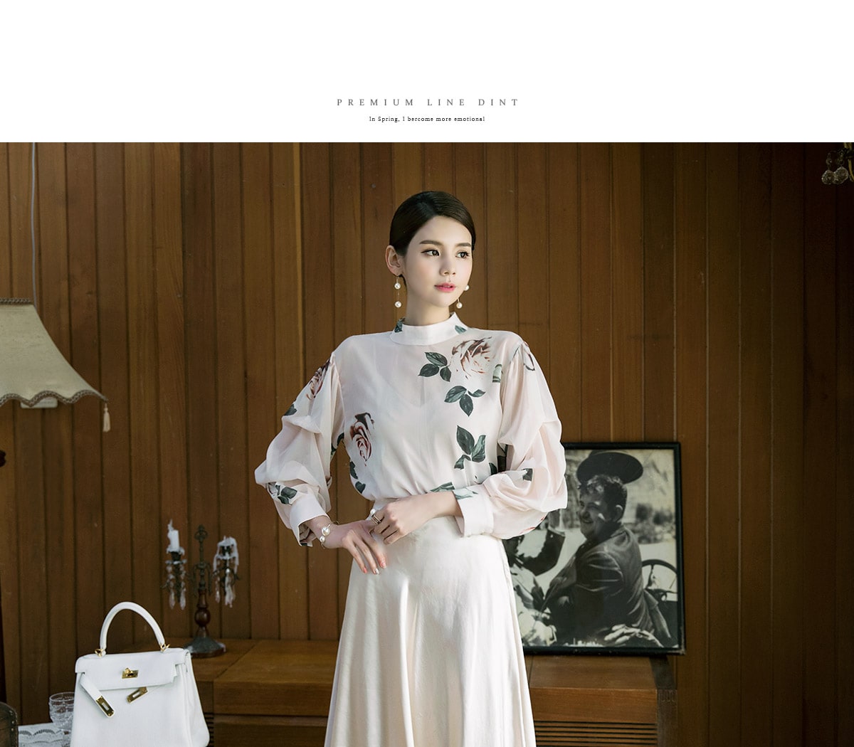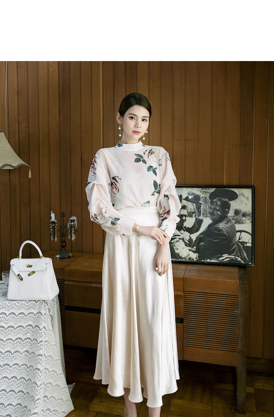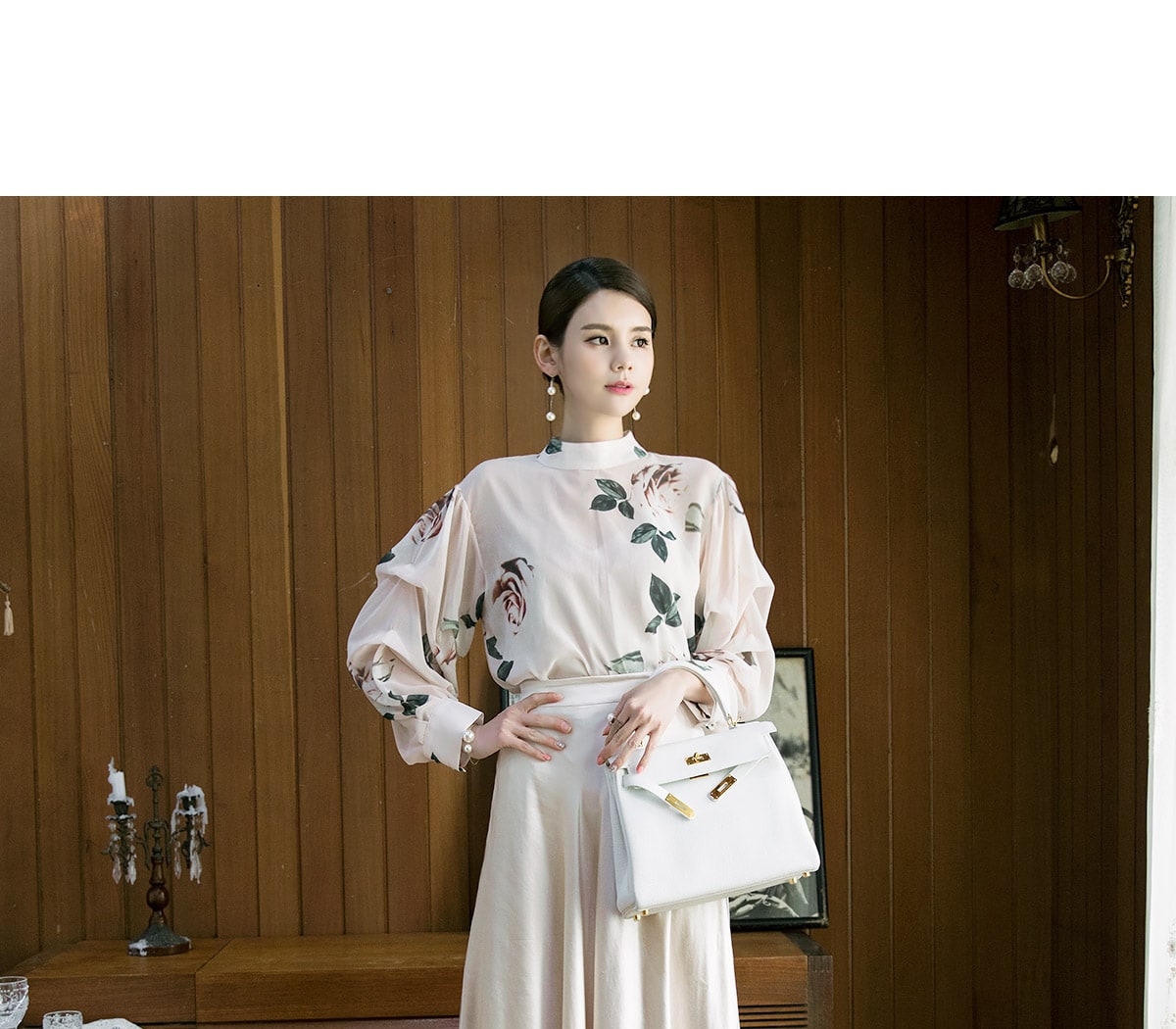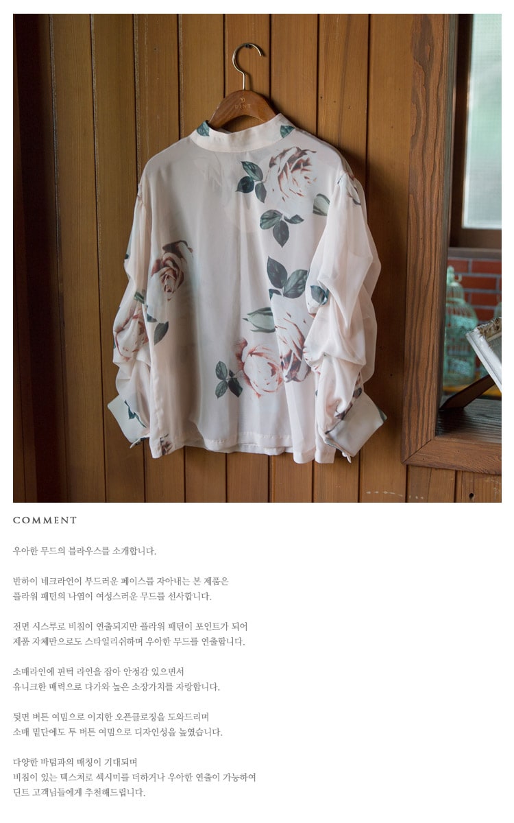 B2201 플라워 소매 핀턱 블라우스 Beige mix