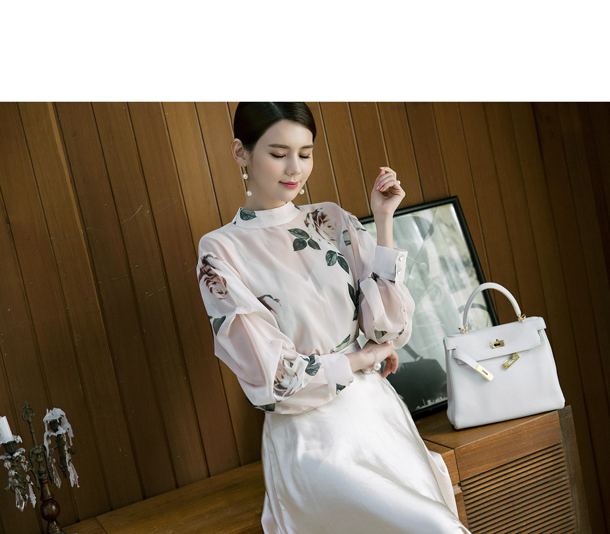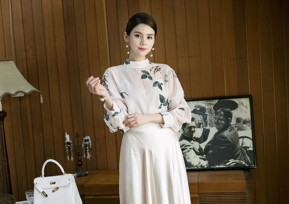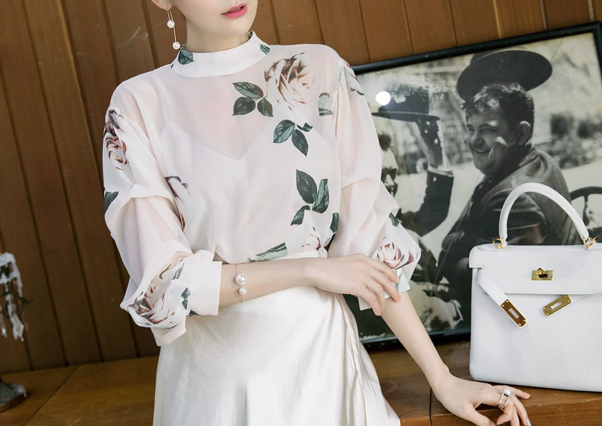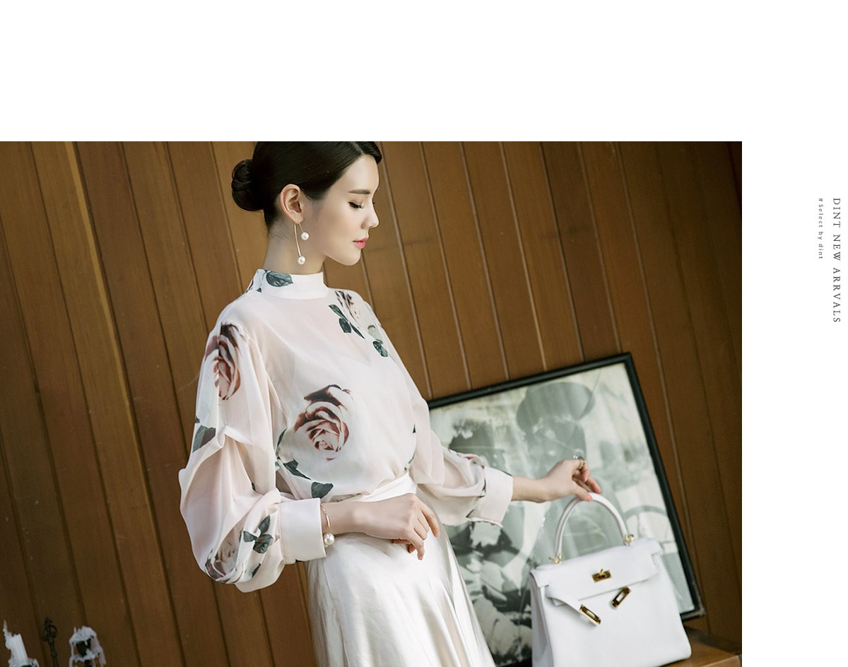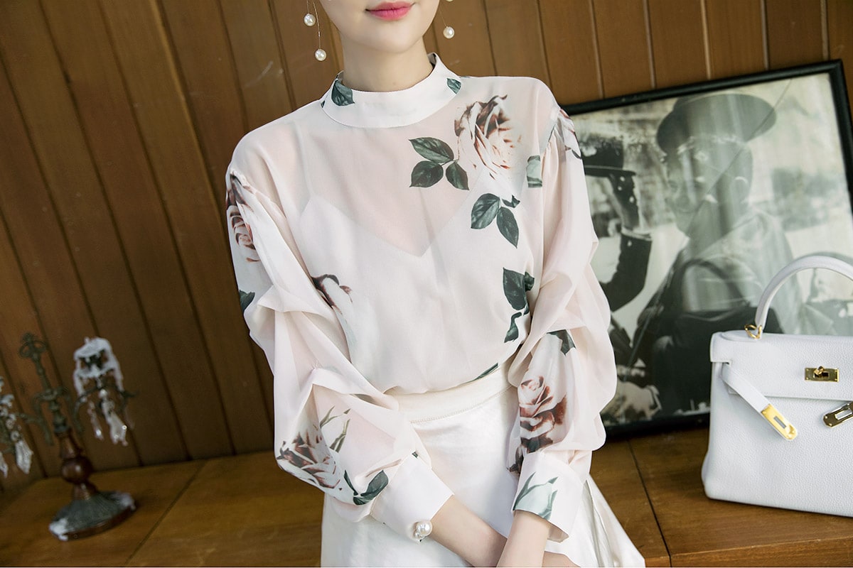 B2201 플라워 소매 핀턱 블라우스 Beige mix
