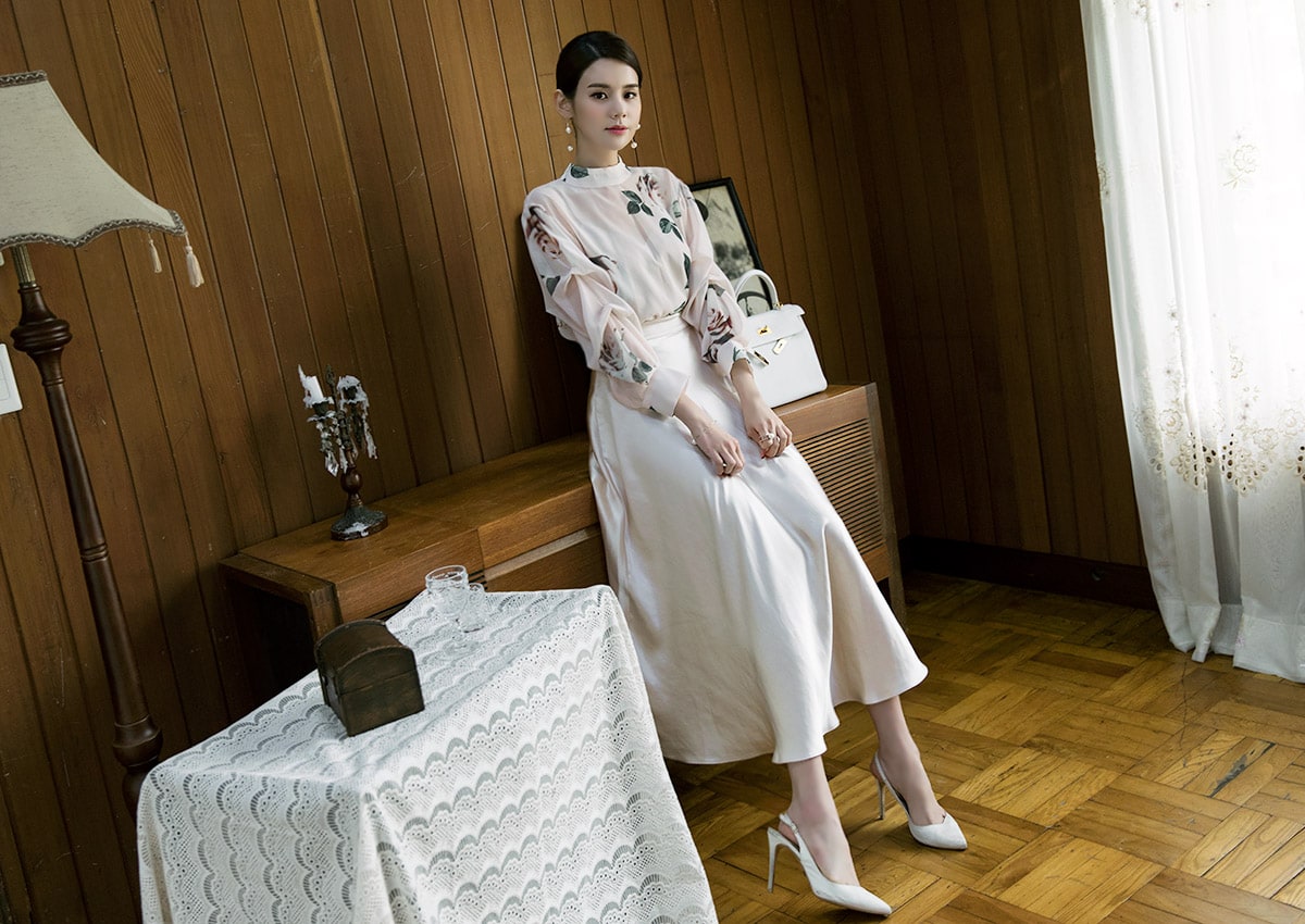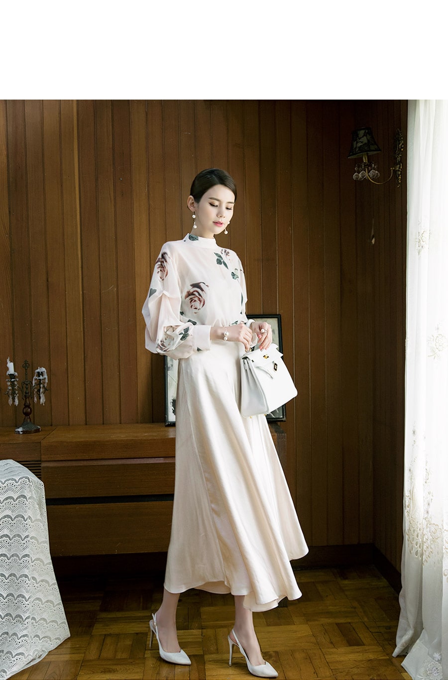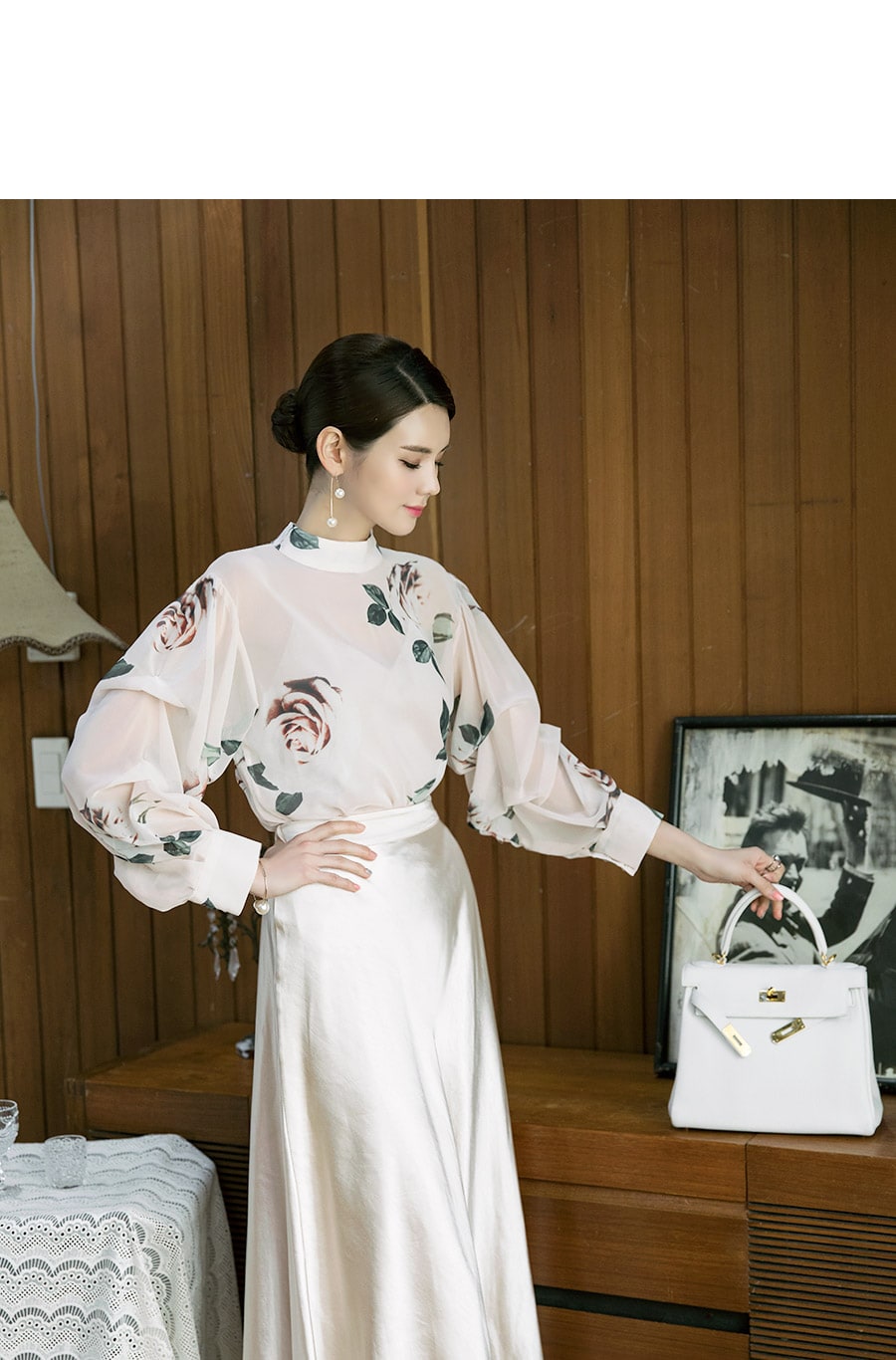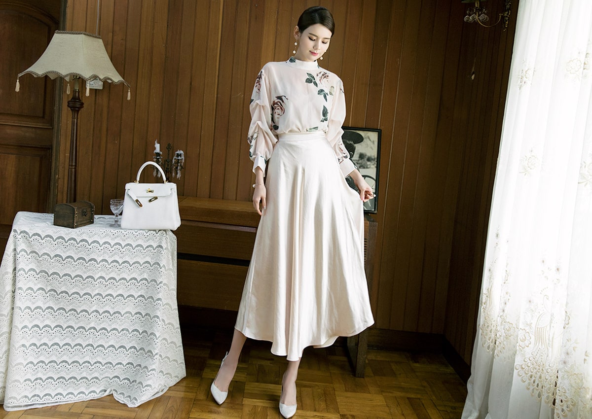 B2201 플라워 소매 핀턱 블라우스 Beige mix