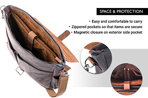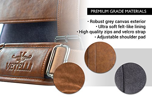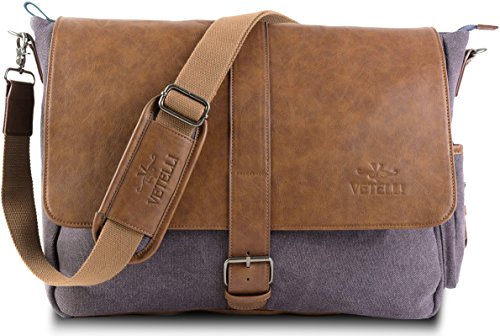 -. Feature : STYLE & FUNCTION - The Vetelli Laptop bag features an elegant classic style that combines perfectly with modern functionality. Spacious interior compartments are fitted out with ultra-soft felt-like lining and a zip-free laptop sleeve to protect laptops, tablets, smartphones & other important accessories from scratches & damage. / SPACE & PROTECTION - This messenger bag is designed to easily carry a laptop (up to 15.6 inches) as well as all your daily essentials. The bag measures 19.5 inches long, 4.5 inches wide & 12.5 inches in height (49.5cm x 11.4cm x 31.75cm). Zippered interior & exterior pockets secure your items won't fall out. A magnetic snap closure on the exterior side pocket and an easy-open zip pocket on the back of the bag makes quick access to cellphones & accessories a breeze. / PREMIUM GRADE MATERIALS - The Vetelli laptop bag combines high grade PU leather with robust grey canvas for the exterior of the bag. The interior features ultra-soft felt-like lining with strong steel zips & a convenient velcro strap. The shoulder strap is adjustable & includes a shoulder pad for easy pain free carrying. Two swivel clips mean this shoulder bag is flexible to use on either shoulder without straps getting tangled. / PREMIUM DESIGN - Unlike most 'run of the mill' messenger bags, the Vetelli laptop bag has been carefully designed with meticulous attention to every last detail. Scratch free (no zip) compartments, resilient hardpoint attachments, magnetic closure clips, soft felt-like interior, custom pocket layout design, durable canvas base, strong steel zips, elegant leather straps, leather zip pullers & many other details make this the ultimate messenger bag for men. / LIFETIME GUARANTEE - Vetelli laptop bags are backed up by a 100% customer satisfaction guarantee.