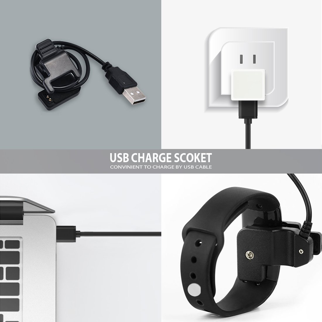 When charging, insert the metal contact on the back of the smart bracelet with the contact point of the included charger.