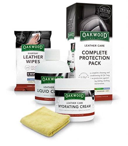 -. Feature : Oakwood Leather Care Complete Protection pack is a a complete cleaning and conditioning kit for long-term protection against cracking, fading, marking and deterioration of automotive upholstery. / Protection Pack includes: Leather Care Liquid Cleaner 250mL, Leather Care Hydrating Cream 350mL, Leather Wipes 150mm x 200mm (x 5 Pack), Quality Microfiber Towel 200mm x 200mm. / Tested & Guaranteed to a Registered, International Leather Care ISO Quality System. / Pack contains four products from Oakwood's integrated complete leather care system to deliver professional care for your leather interior. / Protects leather surfaces against harmful UV (UVA and UVB) exposure, stains, ageing, dehydration and cracking.