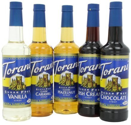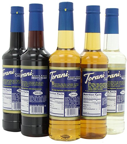 Torani Sugar Free Syrup Variety, (5pack of 750ml) One Each of Sf: Vanilla, Caramel, Hazelnut, Irish Cream, and Chocolate