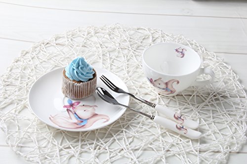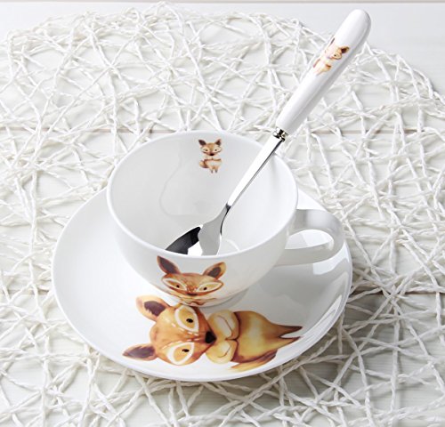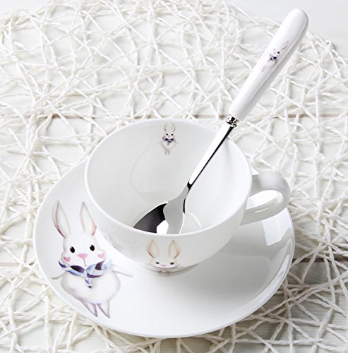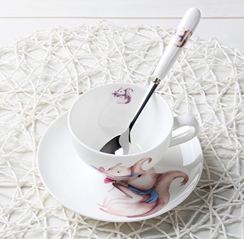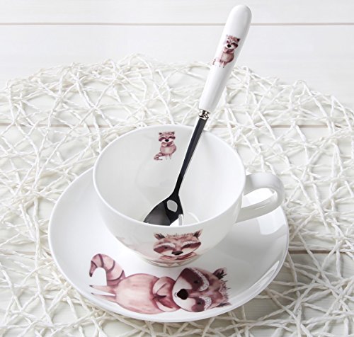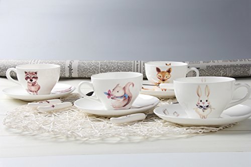SPECIFICATIONS: -->Material:bone china(bone china is high-grade of porcelain/ceramic ) -->Item Package Quantity:8-Piece/4-Set(each set comes with one cup and one saucer) -->Product Size: Cup:11*8.5*5.5-cm,Capacity:180-cc;Saucer:14*14*2-cm;Spoon:16*2.5-cm Cup:4.3*3.3*2.3-inch,Capacity:6-oz;Saucer:5.5*5.5*0.8-inch;Spoon:6.3*1.0-inch -->Pattern:Cartoon Animal Print of Rabbit,Fox,Squirrel,Raccoon