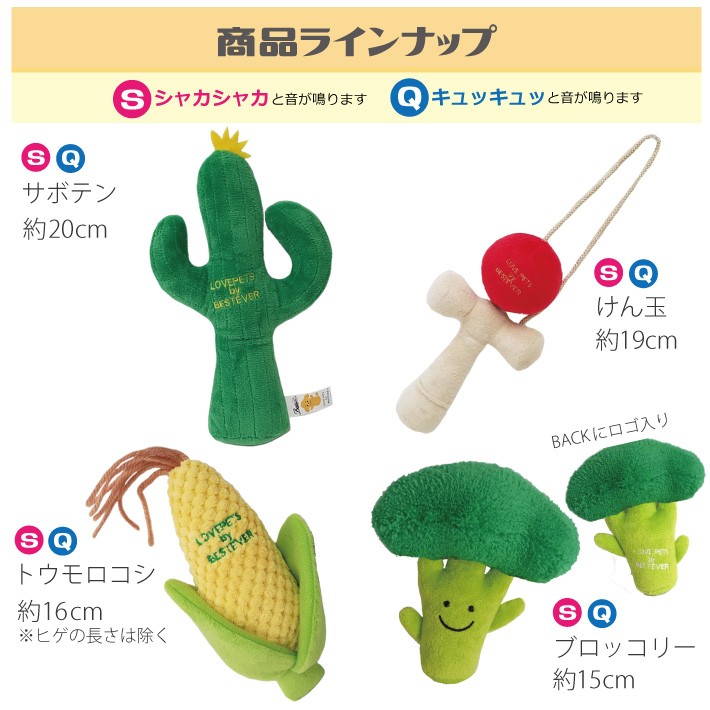 噛むとカシャカシャ、キュッキュッと音がする! ペットトイ ベストエバー その4 全4種 ぬいぐるみ 玩具 イヌ 犬 ペット 音が鳴る けん玉 サボテン とうもろこし ブロッコリー メール便送料無料