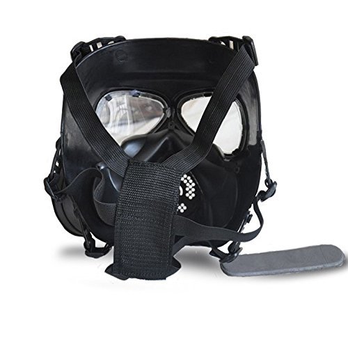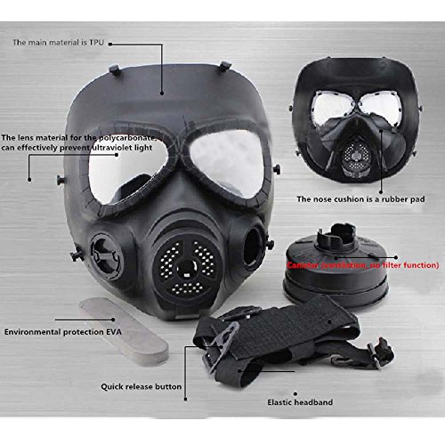 -. Feature : SECURITY:The mask is made of thick shock resistant engineering plastic,very tough and sturdy,the impact resistance of the lens is 420FPS(the effective distance is 5 meters).The high density nylon straps which can keep the mask stable in fierce competition to protect you anytime. / COMFORT: The mask's material is fairly flexible but not massively,fits nicely on face and has rubber on the nose and cheeks inside to add to the comfort.The 2 breathable fans can cooling down the face and ventilate the mask. / COOL:This gas mask is of innovative design and it looks almost real gas mask,so it is great for cosplay,masquerade,halloween,especially for tactical war game / PRATICALITY: The fan canisters work well, two AA batteries are required for each canister(due to shipping safety,package without battery)and the switch is on the outside of the canister, it is a simple push on/off button. / GREAT SERVICE:MANUO can provide the best product service,if you have any question about the product you can contact us,we can solve it for you,thank you!