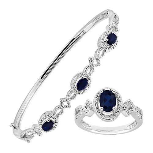 Tie your whole look together with this statement-making set! Crafted in 14K white gold-plated brass, this pendant, hinged bangle, drop earrings, and ring set features oval-cut created sapphires, totaling 5 ct, and a round-cut diamond accent on each. Earrings measure 11/16 by 5/16 inches. Bangle measures 7 1/4 inches in circumference. Ring face measures 3/8 inches in width and is a size 7. Pendant measures 13/16 by 5/16 inches. Pendant comes with a 14K white gold-plated brass 18-inch box chain with a spring ring clasp.Feature