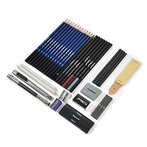 12グラファイト鉛筆、1ソフトグラファイトスケッチ鉛筆、4パステル鉛筆(異なる色合い)、3木炭鉛筆(ソフト、ミディアム、ハード)、2紙混ぜ切り株、1練炭チャープ消しゴム、1鉛筆エクステンダー、4チャコール柳スティック、3チャコールスティック、グラファイトスティック3本、プラスチック削り1本、2本削り1本、プラスチック鉛筆消し1本、アートナイフ1本、サンドペーパーブロック1本、ナイロンケース1本