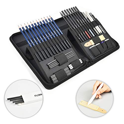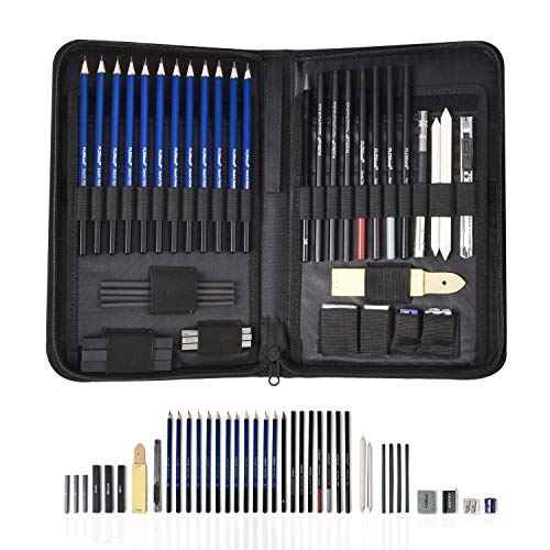 基本的なアウトラインから非常に詳細な傑作に至るまでに必要なものがすべて揃ったこの旅行にやさしいアートキットには、描画、シェーディング、ブレンディング、スケッチを効率的でゴージャスにするために欠かせないグラファイト、パステルカラー、チャコールペンシルがすべて含まれています。