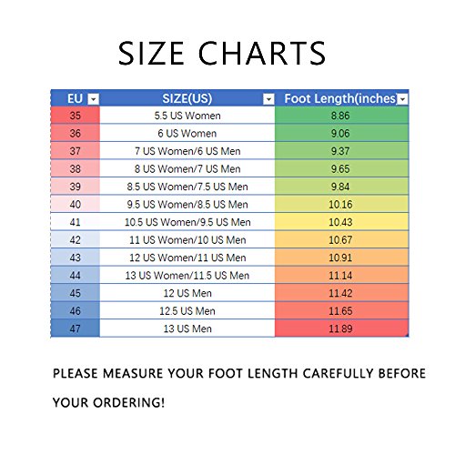 Size Charts: 6 US Women=EU 36=9.06'foot 7 US Women/6 US Men=EU 37=9.37'foot 8 US Women/7 US Men=EU 38=9.65'foot 8.5 US Women/7.5 US Men=EU 39=9.84'foot 9.5 US Women/8.5 US Men=EU 40=10.16'foot 10.5 US Women/9.5 US Men=EU 41=10.43'foot 11 US Women/10 US Men=EU 42=10.67'foot 12 US Women/11 US Men=EU 43=10.91'foot 13 US Women/11.5 US Men=EU 44=11.14'foot 12 US Men=EU 45=11.42'foot 12.5 US Men=EU 46=11.65'foot 13 US Men=EU 47=11.89'foot