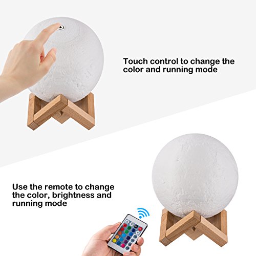 - ENVIRONMENTAL PROTECTION MATERIALS AND EXTREMELY BEAUTIFUL PACKAGING-This 3D print moon lamp is adopted environmentally friendly PLA material, rechargeable lithium battery included.What's included:16 colors moon lamp, remote control, USB charging(include cable without Adapter), woonden stand,charming gift box.