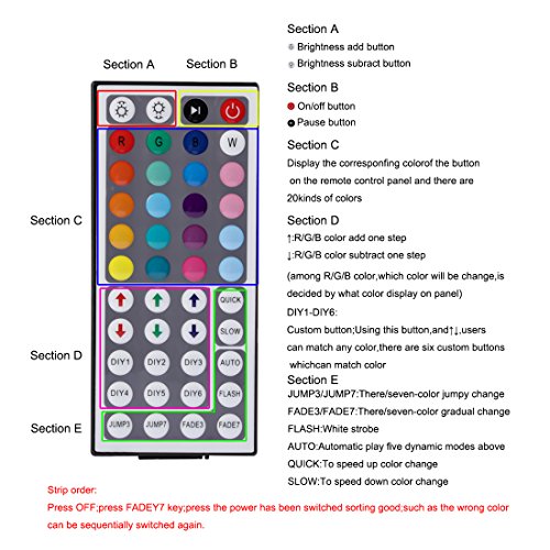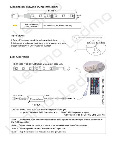 - Include 44Key RGB IR remote controller and 5A power adapter, to change colors, brightness and speed automatically