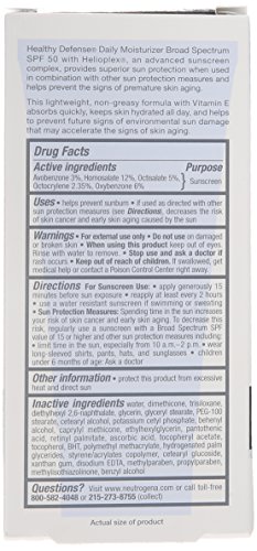 Keep your skin healthy and youthful with Neutrogena Healthy Defense Daily Moisturizer with Broad Spectrum SPF 50 Sunscreen. This complete daily moisturizer helps provide superior protection from skin aging effects of the sun, when used with other sun protection measures. It absorbs quickly and keeps skin hydrated all day. This Broad Spectrum SPF 50 lotion contains Helioplex, an advanced sunscreen technology with Broad Spectrum UVA/UVB protection. The moisturizer protects against UVB rays, which cause sunburn and UVA rays, which contribute to premature lines, wrinkles, sagging, and age spots. Formulated with the exclusive antioxidant blend with pure vitamin E, it also helps prevent environmental damage to your skin. This daily moisturizer comes from the Neutrogena Healthy Defense collection, and is the number-one dermatologist-recommended facial moisturizing product.Feature