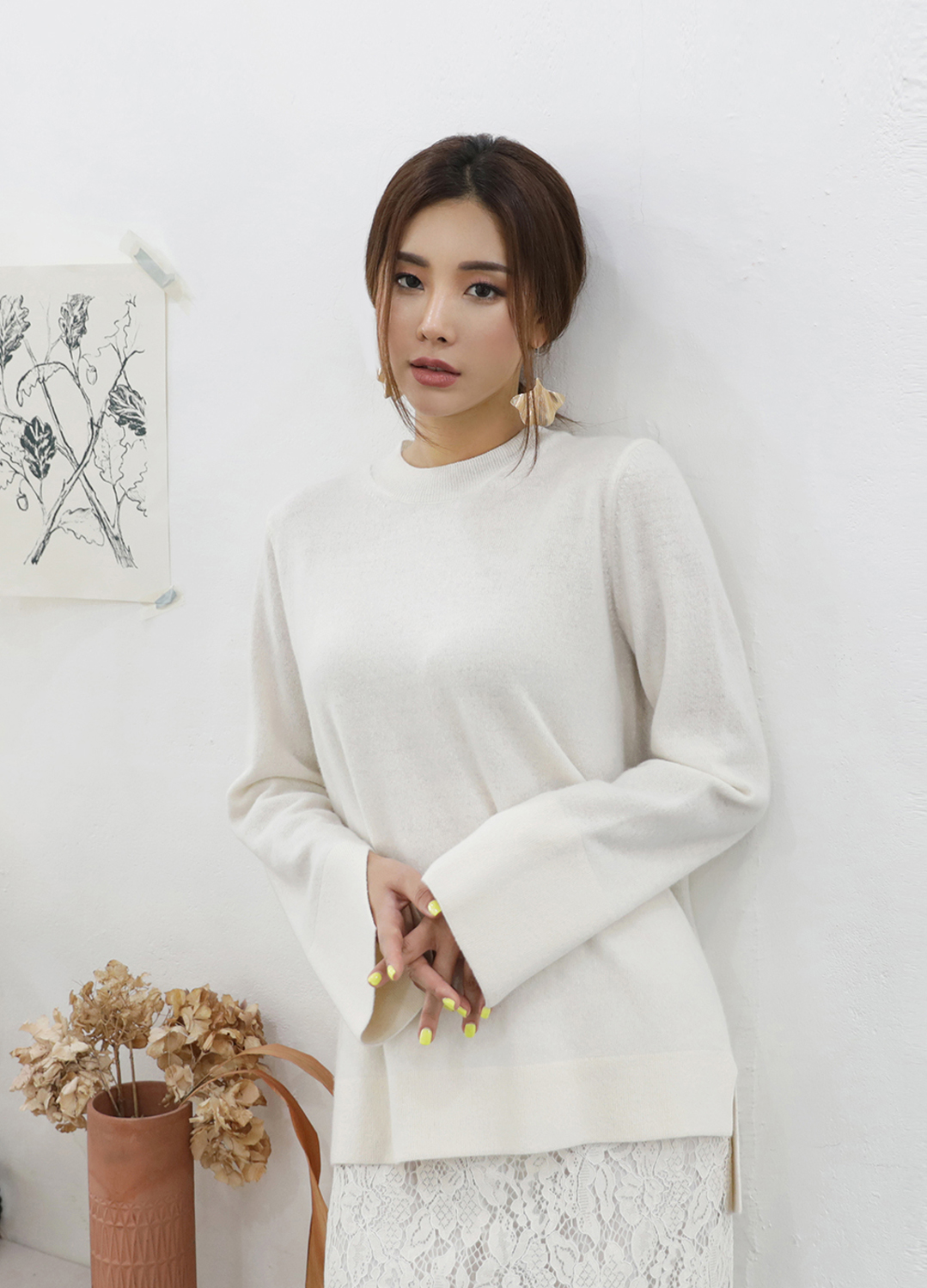 적당한 두께감으로 단독으로 입거나 셔츠와 함께 입으셔도 되는 데일리 니트 입니다. 따갑거나 까스러움이 없는 캐시 혼방의 니트로 살짝 짧은 기장감의 넉넉한 핏으로 부담스럽지 않게 자켓이나 코트와 입으실수 있습니다.