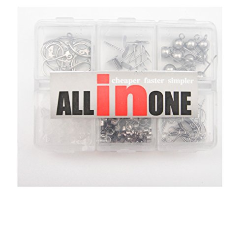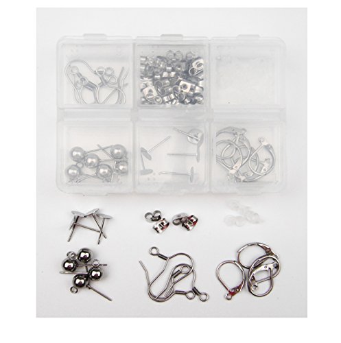 Package includes: 10pcs earring hooks, 10 flat pad findings, 10pcs leverback findings, 10pcs half ball earring stud pins, 40pcs earring backs