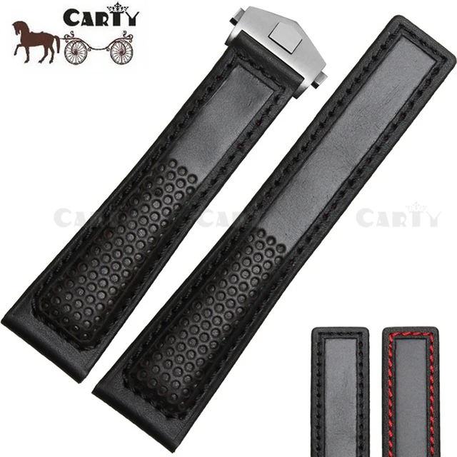 22 미리메터 블랙 레드 정품 소 가죽 공기 투과성 실버 블랙 butterfly 버클 남성 시계 스트랩 맞춤 브랜드 시계