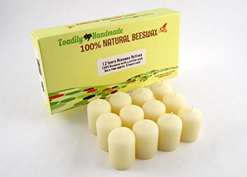 One dozen (12) Hand Poured Solid Beeswax Votive Candles in Ivory Wax - 100% Beeswax Candles by Toadily Handmade - Now Packaged in an Attractive Gift Box!