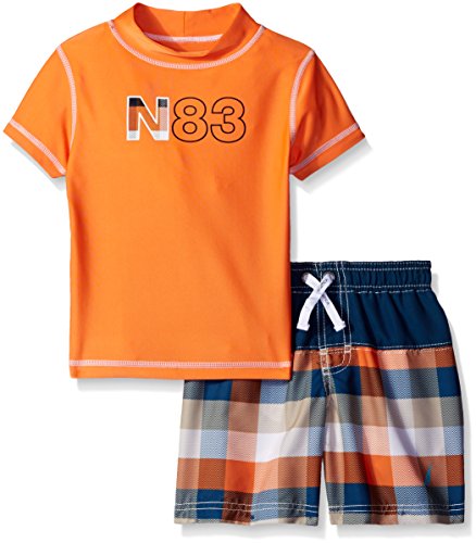 Two-piece swim set featuring short-sleeve rash guard with low-standing collar