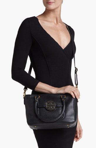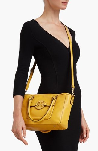 Tory logo in front, golden hardware, exterior flap pocket, Canvas lining.
