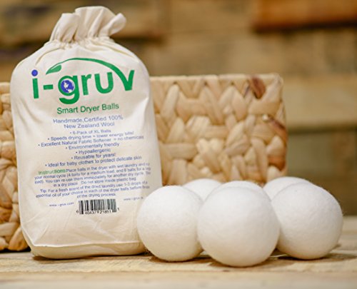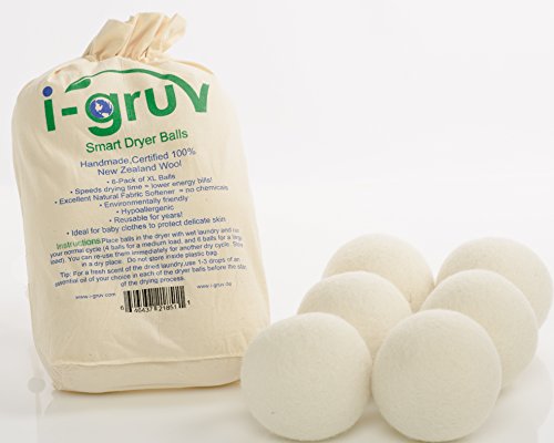 WOOL DRYER BALLS BY I-GRUV SET OF 6 XL ~ HAND MADE PURE ECO FRIENDLY 100% NEW ZEALAND WOOL, ALL NATURAL FABRIC SOFTENER ~ ANTI STATIC LAUNDRY, ~ ORGANIC, REUSABLE FELT HYPOALLERGENIC BALL ~ NO DRYER SHEETS ~ BEST FOR NEW BORN BABY MOM TO BE GIFT BASKET AND CLOTH DIAPERS