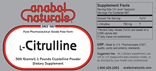 -. Feature : + L-Citrulline for Athletic Performance, Longevity and Healthy Aging / + AnabolNaturals-The Highest Quality 100% Pure Crystalline Pharmaceutical Grade Free Form Amino Acids Since 1983 / + USP: Made to U.S. Pharmacopeia (USP) quality, purity and potency standards. / + HEALTH BENEFITS OF L-CITRULLINE: INCREASES MUSCLE PROTEIN SYNTHESIS, PROMOTES TISSUE HEALING, INCREASES ENERGY AND INCREASES NITRIC OXIDE. / + 500 grams pure pharmaceutical grade free form crystalline powder = 5 month supply. List P.R.Ice is $119.95.