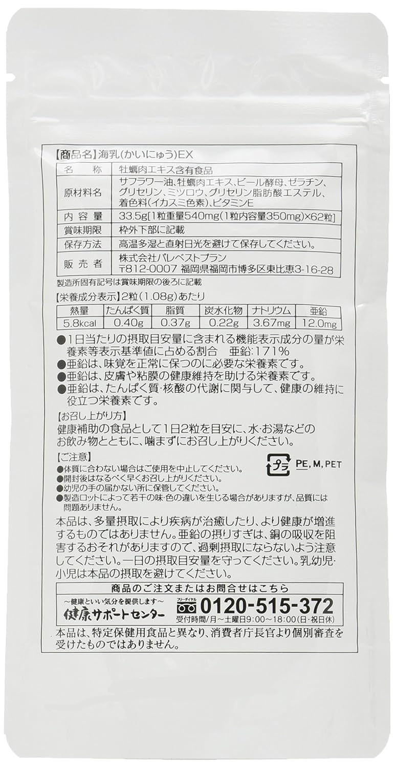 内容量 :33.5g(1粒540mg×62粒)摂取目安量:1日2粒を目安に水またはぬるま湯でお召上がりください。保存方法:直射日光・高温多湿を避けて常温で保存してください。賞味期限:約2年原材料:サフラワー油、牡蠣肉エキス、ビール酵母、ゼラチン、グリセリン、ミツロウ、グリセリン脂肪酸エステル、着色料(イカスミ色素)、ビタミンE新品未開封です。数量限定でお買い得ですので、この機会にいかがでしょうか。