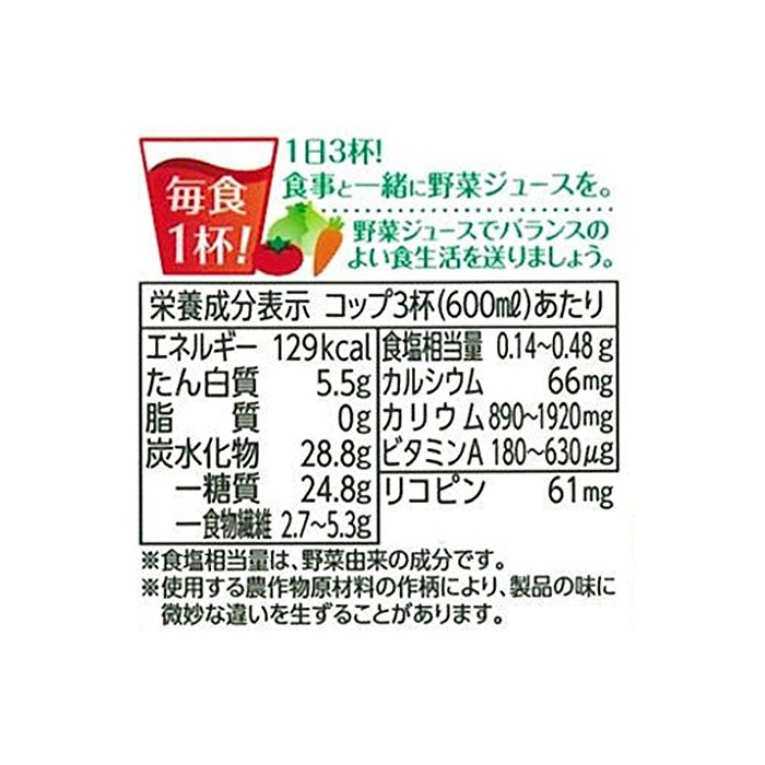 원재료:토마토 쥬스(농축 토마토 환원)고, 야채 쥬스((당근)인삼(농축 환원)고, 셀 리,양상추(농축 환원)고, 무우(농축 환원)고, 읽 #(농축 환원)고, 평지의 변종,K《루》,비츠,시금치,친 겐 코뿔소(농축 환원)고, 타마 파(농축 환원)고, 파슬리(농축 환원)고, 래디시,《구레손》,아스파라거스(농축 환원)고, 브로콜리(농축 환원)고, 호박(농축 환원)고, 양배추(농축 환원)고, 피망(농축 환원)고, 콜리플라워(농축 환원))고, 향신료 추출물