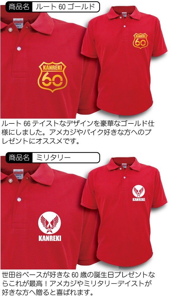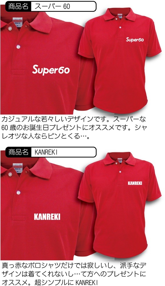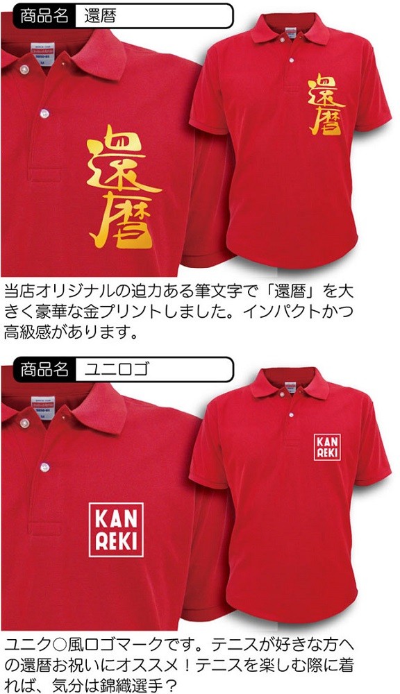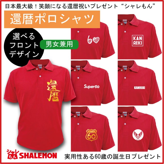 還暦祝いに赤いポロシャツをプレゼントしましょう。 当店のポロシャツはお肌にやさしい綿100%素材はご年配の方でも安心して着用いただけます。 しっかりとした厚手生地を使用しておりり、高級感あります。 通気性も良く、スポーツ時の着用もOK! ゴルフなんかにさりげなく着るのも良いですね♪ デザインは8種の中からお選びいただけます。 シンプルなものからインパクトのあるものまでございますので、贈る方のイメージに合わせてチョイスしてくださいんませ。 男女兼用でサイズはXS/S/M/L/XLがあります。 小柄なお母さんにはXSサイズ、かっぷくの良いお父さんにはXL等、体型に合わせてお選びください。 当店“シャレもん”には還暦ポロシャツだけでなく、下着・タオル・靴下・帽子・バック・トレーナー等日本最大級の品揃えで還暦商品を取り扱っております。 購入金額3,800円(税抜)以上で送料無料ですので、合わせてご購入いただくことをオススメいたします。
