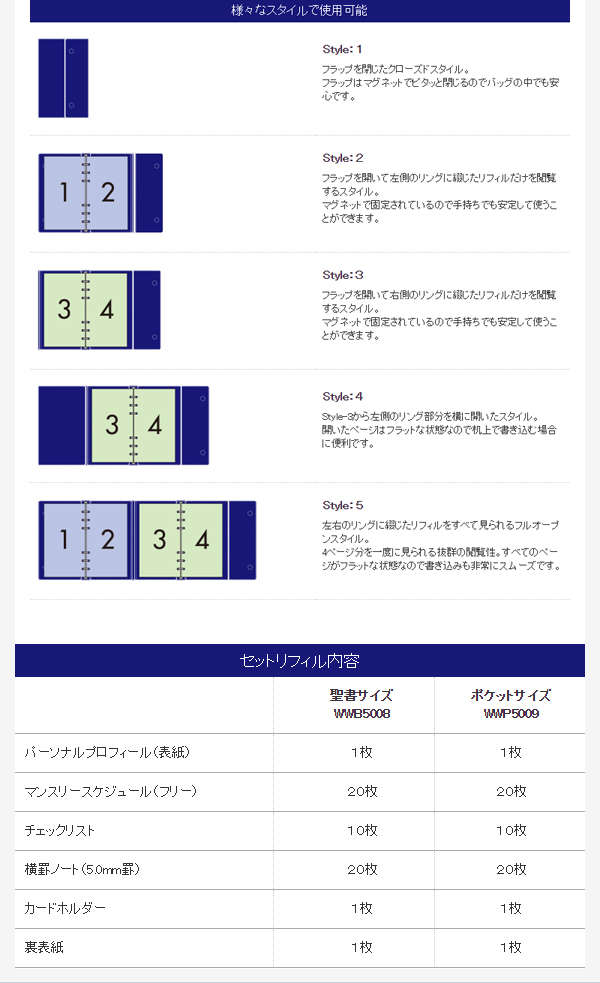 ●2種類のリフィル、4ページ分を同時に見られるので、スケジュールとノート、仕事とプライベートでの使い分けなど、様々な組合せで使用できます。フルオープン時は非常にフラットなので書き心地も抜群です。リフィルの組合せは無限大、使う人にとって最も効率的な組合せで自分だけの楽しい手帳を作ることができる、まったく新しいシステム手帳です