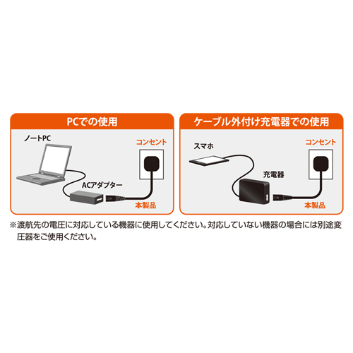 ●別途変換プラグを用意する必要が無いので、行き先が決まっている際にも便利です。