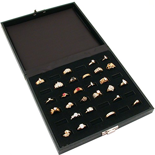 -. Binding : Kitchen -. Brand : FindingKing -. Color : Black -. Feature : This is a new black wide slot ring display case with latch / Beautifully display up to 36 rings / The latch on the lid helps keep you from loosing any items / It measures approximately 8 1/4" x 7 3/8" x 1 5/8" (211 x 186 x 42 mm) -. Model : 84-RBKBK -. MPN : 53940570 -. PartNumber : 53940570 -. ProductGroup : Home -. ProductTypeName : HOME -. Title : 36 Slot Ring Tray Black Travel Jewelry Showcase Display