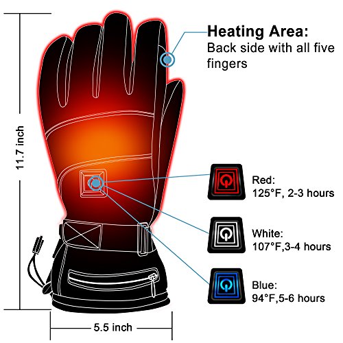 SPECIFICATION Material: waterproof clothes, cotton, PU leather Package:1 X touchscreen heated gloves, 2 X 3.7V batteries, 1 X charger SIZE: Button type heated gloves: total length:11.7 inches, middle finger length:4.1inches, total width:5.5inches Non button type heated gloves: total length:12.4 inches, middle finger length : 6.3inches, total width: 3.9inches Gender: unisex PRODUCT FEATURES ? The electric heating gloves are made of premium quality materials, keep your hands warm and cozy. ? Stylish black color and elastic wrist band, suitable for men and women. ? Instant heat, powered with 3.7V batteries, the temperature up to 50℃/ 122°F. ? Waterproof and breathable, don't worried wear them in rainy and snow day ? Perfect for outdoor activities like hiking, fishing, camping, hunting, running ? Serves as a warm gift for your parents, friends NOTICE 1.Machine washable, make sure you remove batteries first, recommend hand wash. 2.Please measure your palm size to make sure it will fit your hands,button type heated gloves much smaller than non button type heated gloves. 3.When the battery is charging, the charger is red, when the battery is full, the charger turns green. 4. To make it work more efficient, click the highest setting let it work for about 15-20 minutes and immediately switch to lowest setting to save more battery life. 100% SATISFACTION GUARANTEE If you have any problem with this battery operated heating gloves, please feel free to contact us! We will solve it quickly and in the best way! 0