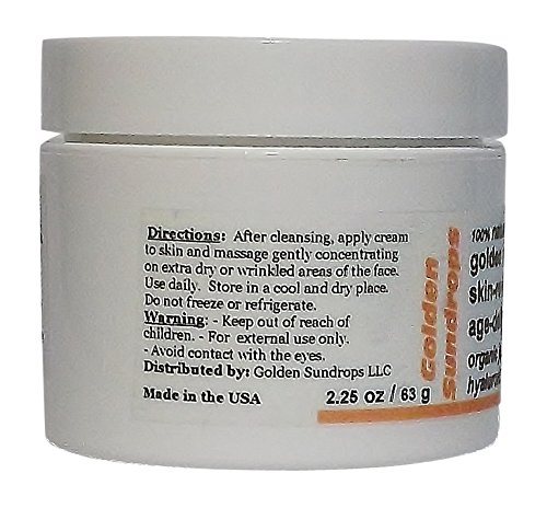 -. Feature : This cream recipe is based on the best herbal traditions and modern scientific knowledge from around the world. Formulated of 100% natural, organic, certified organic ingredients - A TRUE BLESSING FOR YOUR RADIANT SKIN. It works to erase wrinkles and fine lines at the cellular level - below the surface of the skin - which is why it is so effective. / 100% chemical free formula. Contains NO chemical additives, preservatives, Sulfates, Parabens, Phthalates, Petrochemicals, or artificial fragrances that could irritate and damage the skin ( and even cause cancer ). / This ULTRA-RICH cream replenishes the skin and reduces the appearance and deph of lines and wrinkles for a visibly firmer younger-looking complexion. It's balanced and high-potency formula provides powerful antioxidant action, soothing hydration, restores softness and elasticity, REDUCES THE APPEARANCE AND DEPTH OF WRINKLES with regular use. / This cream is enriched with high-potency Vitamin C and Hyaluronic Acid. VITAMIN C - Is the key to maintaining healthy, youthful skin. It is a powerful antioxadent that slows the rate of free-radical damage, which causes skin's dryness, fine lines, and wrinkles. It produces COLLAGEN - a protien which makes skin appear plump and firm. HYALURONIC ACID - Is the most powerful moisturizer and humectant known so far. It works by binding to moisture. It can hold up to 1000 times its weight in water, making it an excellent natural skin plumper. It helps your skin repair and regenerate itself after suffering from dryness, environmental stresses, or irritaion. Together they multiply their effectiveness. / As a rich moisturizer, it makes an excellent night cream, and may also be used as a day cream. Wear it under or instead of makeup to help reduce UV ray damage from sun exposure - and keep skin hydrated all day long. Apply cream to skin and massage gently concentrating on extra dry or wrinkled areas of the face. The KEY to best skin health is to choose the cream(S) that contain the highest and purest quality ingredients, GOLDEN SUNDROPS - 100% NATURAL, ORGANIC - GOLDEN ELIXIR SKIN REVITALIZING THERAPY - AGE DEFYING CREAM is the top choice for healthy, younger-looking skin.