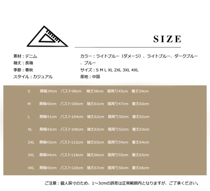 デニムジャケット メンズ 春 Gジャン ジージャン デニムジャケット デニムアウター ショート丈 ブルゾンジャケット 2018新作登場 送料無料 デニムジャケット メンズ 春アウター コート Gジャン 大きめ商品詳細素材:デニム袖丈:長袖季節:春秋スタイル:カジュアルカラー:ライトブルー(ダメージ)、ライトブルー、ダークブルー、ブルーサイズ:S M L XL 2XL 3XL 4XL産地:中国サイズ参照表S 肩幅39cm バスト98cm 袖丈58cm 裾周り45cm 着丈59cmM 肩幅40cm バスト100cm 袖丈61cm 裾周り47cm 着丈60cmL 肩幅41cm バスト104cm 袖丈62cm 裾周り50cm 着丈62cmXL 肩幅42cm バスト106cm 袖丈63cm 裾周り52cm 着丈63cm2XL 肩幅43cm バスト112cm 袖丈65cm 裾周り54cm 着丈64cm3XL 肩幅44cm バスト116cm 袖丈66cm 裾周り55cm 着丈65cm4XL 肩幅45cm バスト120cm 袖丈67cm 裾周り56cm 着丈66cmご注意:個人採寸のため、1~3cmの誤差は正常範囲内となりますが、ご了承ください。デニムジャケット メンズ 春 Gジャン ジージャン デニムジャケット デニムアウター ショート丈 ブルゾンジャケット 2018新作登場 送料無料 デニムジャケット メンズ 春アウター コート Gジャン 大きめ