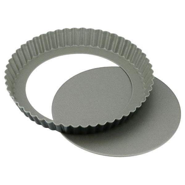 くずれやすいタルト生地を離れやすくする底取れ式の焼型です。フッ素樹脂加工でお手入れも簡単。