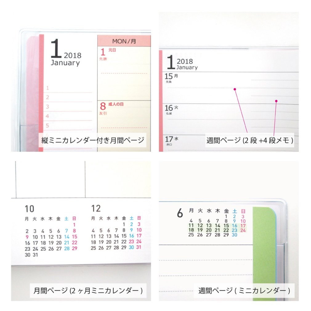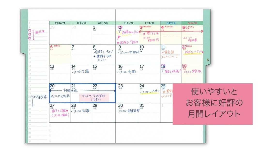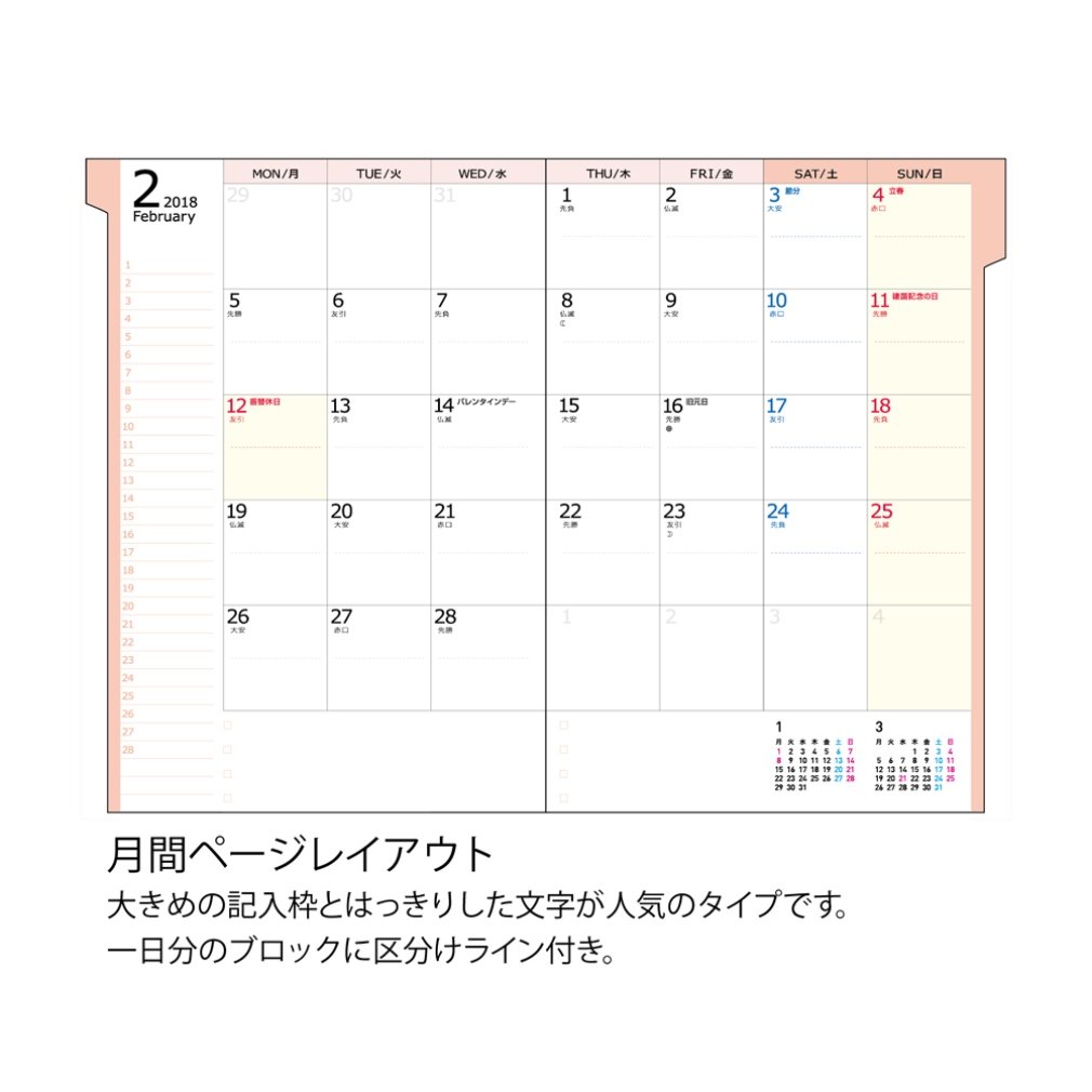 · The monthly page layout is a popular type with a bigger entry frame and a clear type of character, with a division line for one day's block