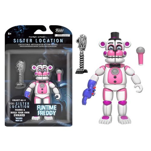 -. Feature : Your favorite characters from Five Nights at Freddy's Sister Location are now awesome articulated action figures! This Five Nights at Freddy's Sister Location Funtime Freddy 5-Inch Action Figure brings the fun time version of Freddy Fazbear to life! This action figure includes a microphone accessory as well as a build-a-figure piece to build your own Ennard action figure! Funtime Freddy comes packaged in blister-card packaging.