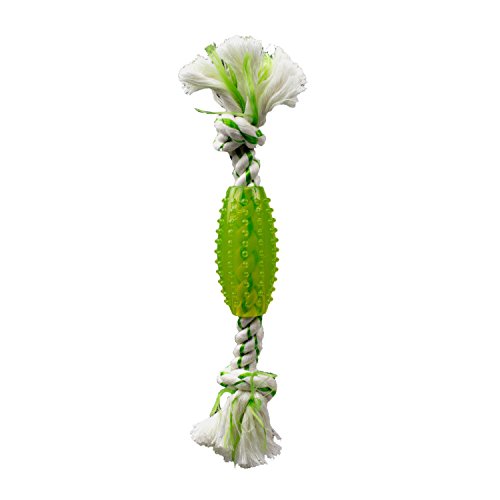 Canine Clean Spearmint TPR Tube with Rope - a 6" toy with a spearmint scented TPR tube with rope. The toys special dumbbell shape and TPR rubber dogs can tug, toss, and tackle tartar. Canine Clean toys promote play and enhance dental health. Using multiple textures these dental chew toys offer hands free brushing and discourage destructive chewing. Great for massaging gums, removing tartar, and encouraging healthy play.Feature