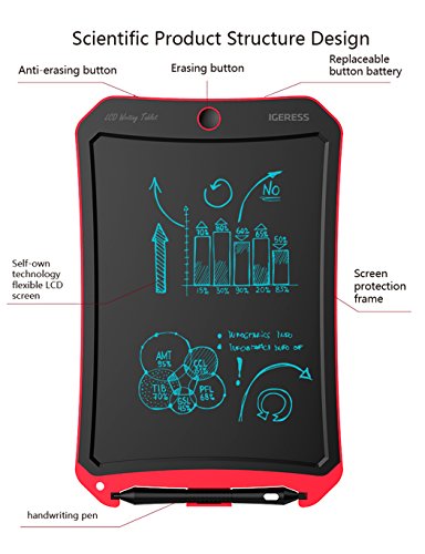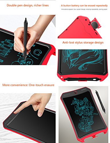 -. Feature : Newest Fashion Design: This electronic writing tablet with cool robot element design and red color is really funny, fashion, beautiful and unmatched, let kids happy to learn and entertain with it! / New Generation Flexible Brighter LCD Screen: More delicate and brighter lines, Restore real touch, Drawing like as using paper, Rich pressure sense, Free to draw a thick and different smooth lines! / Replaceable and Durable Battery: Low-power design, erasing repeatedly more than 50000 times; You can replace the battery yourself, also the kids can't open the battery cover themselves in order to avoid swallowing! / Anti-erasing Button: This LCD writing board has a anti-erasing button on the top, it's very useful for anti-inadvertent touch when writing or drawing on it with opening the button! / Double Pen and Anti-lost Stylus Storage Design: The LCD writing tablet will has richer lines with double pen design and the stylus are hard to lost with the anti-lost stylus storage design!