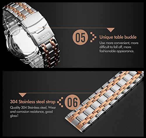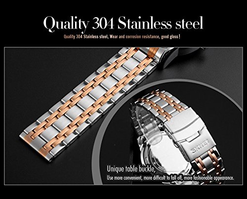 -. Feature : Men's business noble stainless steel strap watch , fashion and charmting to wear. / Stainless steel watchband and alloy case with safety fold over clasp,no any hurt of your clothes or hands. / Unique dial date window, easy to use and convenience for your life. / Organic hardened glass, scratch resistant, high hardness. / Water resistant up to 3 ATM (Suitable for everyday use. Splash/rain resistant.NOT suitable for diving, swimming, snorkeling, water-related work).