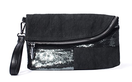 Spacious clutch measures 9.4(L)x5.1(H)x1.6(W) inches overall with 3 pockets, one main compartment, one built-in phone pocket and one interior zipper pocket. Weights 7 ounces.
